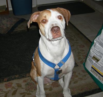 Any time this big boy sees another dog (and sometimes a person as well), he reacts very strongly. I have used a choke collar, and he is getting very good at walking with it. However, when he sees another dog, it is all I can do to control him.